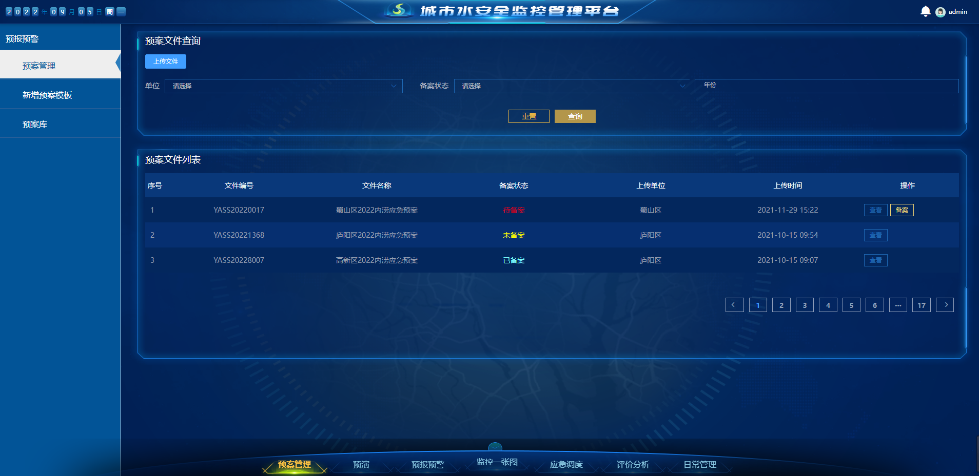 城市水安全監(jiān)控管理平臺(tái)分為預(yù)案管理、預(yù)演、預(yù)報(bào)預(yù)警、監(jiān)控一張圖、應(yīng)急調(diào)度、評(píng)價(jià)分析、日常管理七個(gè)功能模塊。