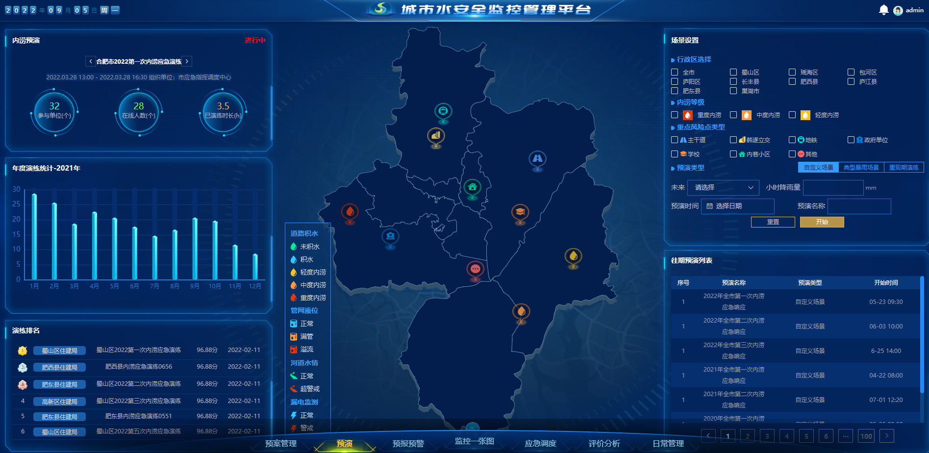 預(yù)演模塊通過設(shè)置不同降雨場(chǎng)景,包括自定義場(chǎng)景、典型暴雨場(chǎng)景以及根據(jù)歷史數(shù)據(jù)復(fù)盤已發(fā)生過的城市內(nèi)澇場(chǎng)景,提前對(duì)所有可能發(fā)生的極端突發(fā)狀況進(jìn)行定期模擬演練。