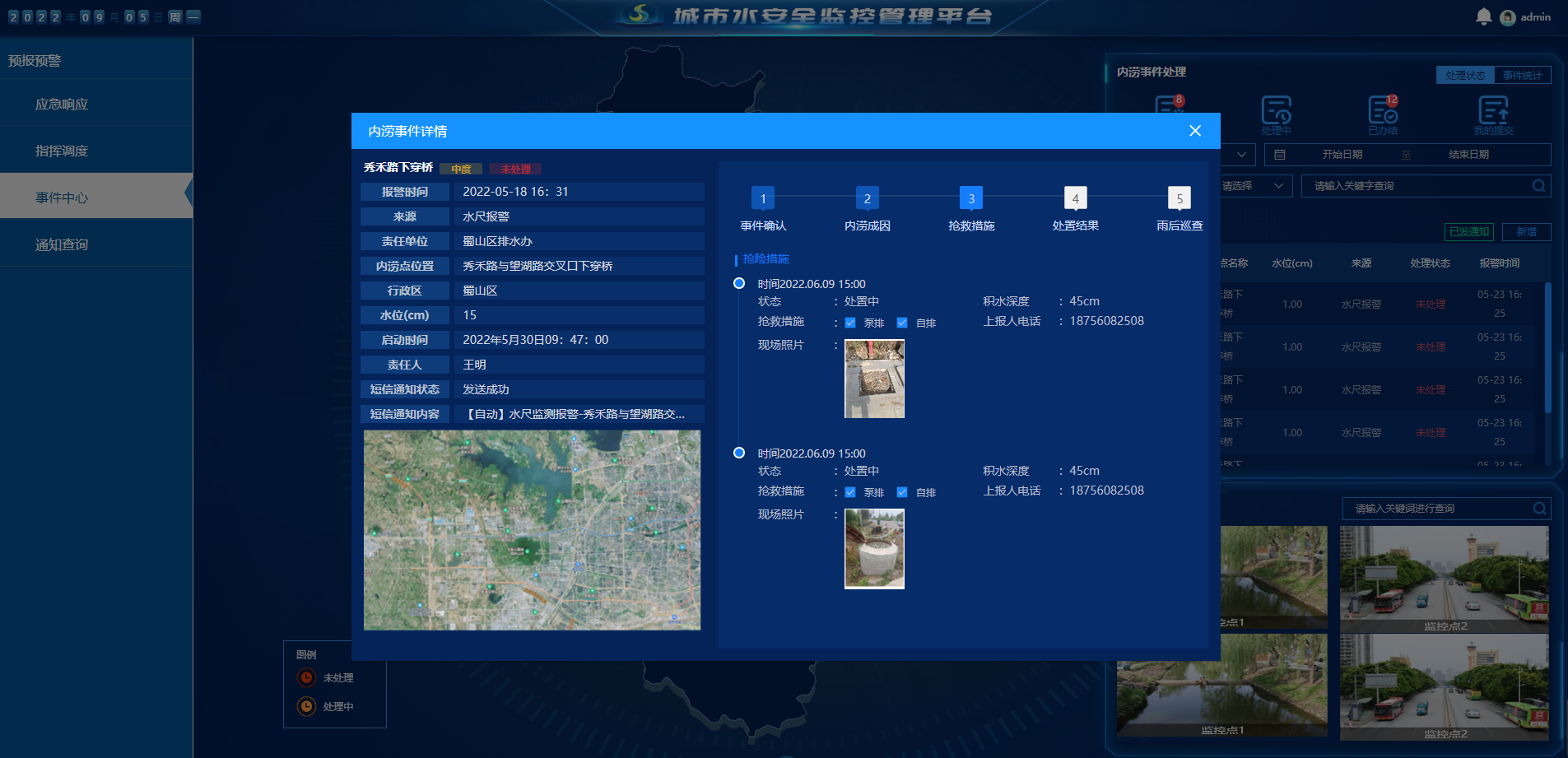 通過物聯(lián)感知、外部氣象、模型推演、移動(dòng)巡檢、公眾反饋五源全面及時(shí)獲取積澇信息,GIS地圖直觀展示城市內(nèi)澇點(diǎn)分布數(shù)量、雨量、水位、趨勢(shì)、積澇程度、視頻監(jiān)控、是否漏電等實(shí)時(shí)監(jiān)控信息,如遇水情告警,可立即定位處理。
