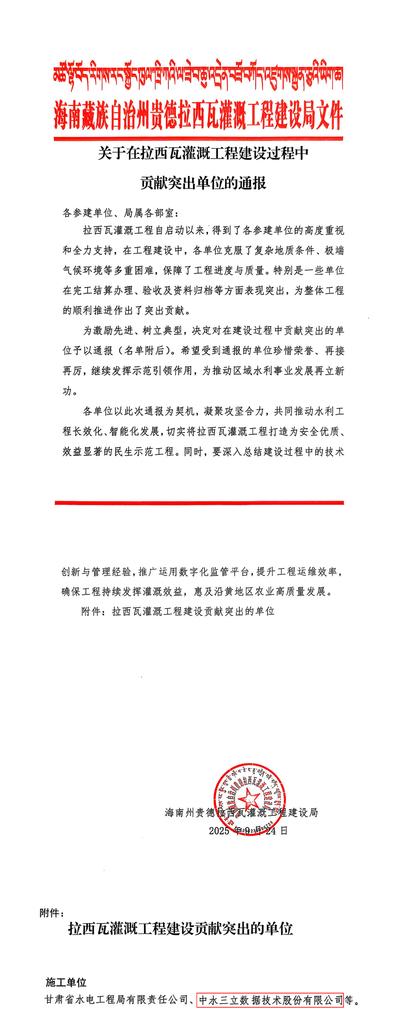 高標(biāo)準(zhǔn)交付,高效率運(yùn)管!中水三立承建青海省貴德縣拉西瓦灌溉工程獲表彰激勵(lì)