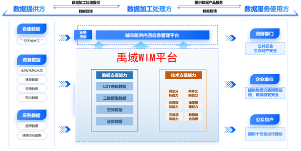 水利、氣象、環(huán)保、交通、電力等部門多源數(shù)據(jù)匯聚融合,通過禹域WIM平臺,為城市防洪除澇應急管理平臺提供數(shù)據(jù)支撐和技術(shù)支撐,實現(xiàn)平臺功能,服務于平臺用戶。